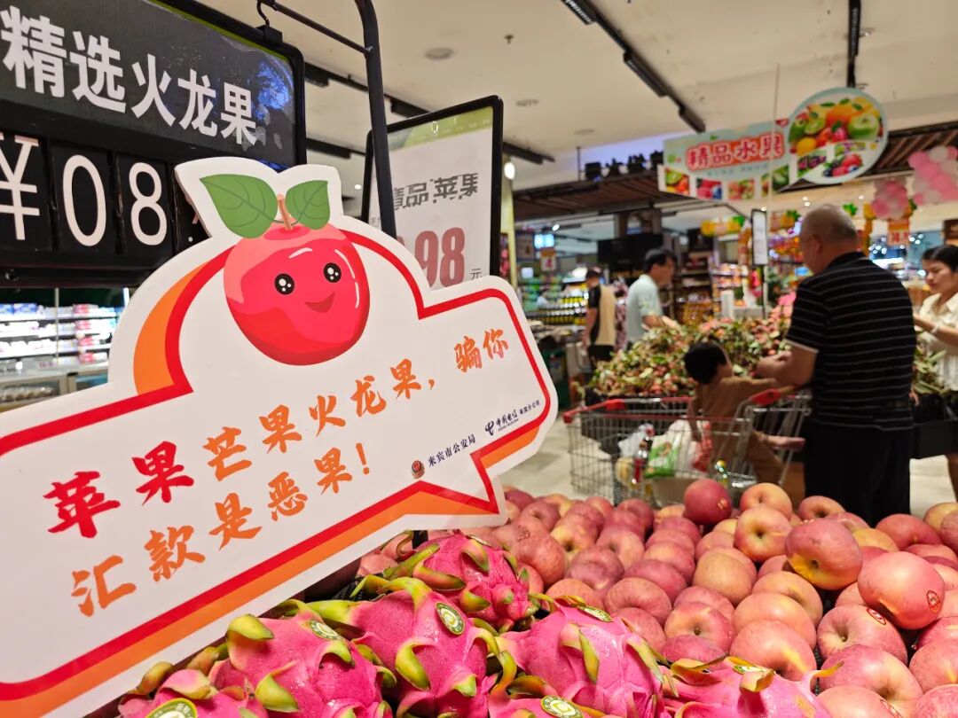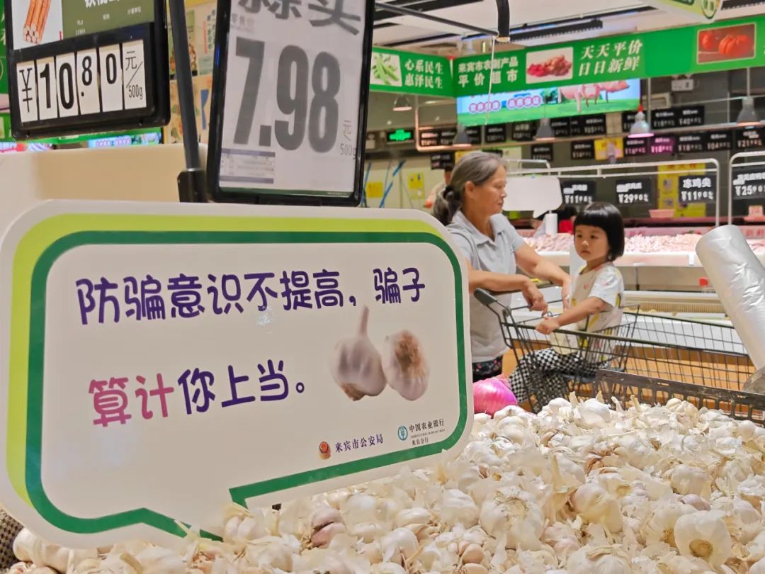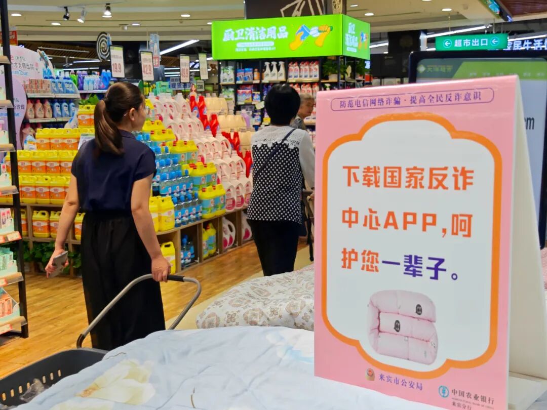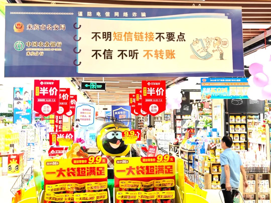 近日,为了增强群众的防骗识骗能力,来宾市打击治理电信网络新型违法犯罪工作局际联席办相关成员单位使用警企联动的方式,在超市、菜市场等人流量大的购物场所摆放反诈宣传标牌,将反诈元素融入百姓的日常生活中,让大家在购物的同时,也能学到反诈知识。