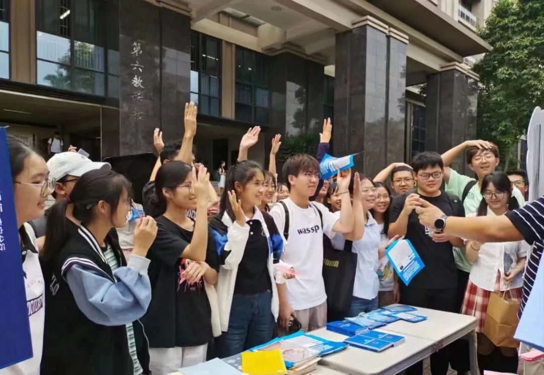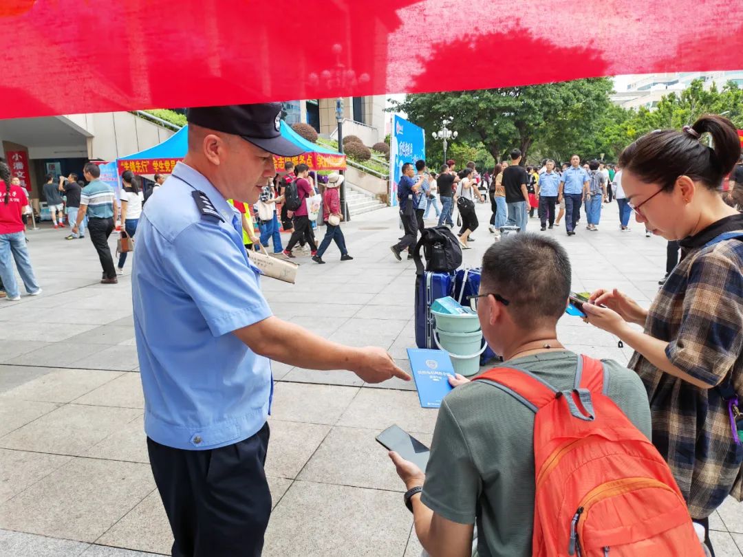 民警在校园内向师生和家长发放反诈宣传册。