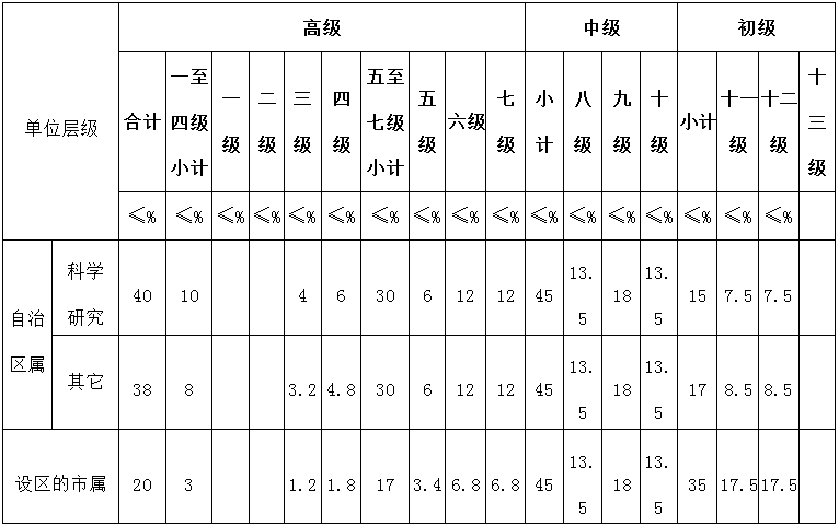 2.专业技术高级、中级、初级岗位内部不同等级之间的结构比例,全区总体控制目标为:二级、三级、四级岗位之间的比例为1∶3∶6;五级、六级、七级岗位之间的比例为2∶4∶4;八级、九级、十级岗位之间的比例为3∶4∶3;十一级、十二级岗位之间的比例为5∶5;十三级岗位根据工作需要设置。