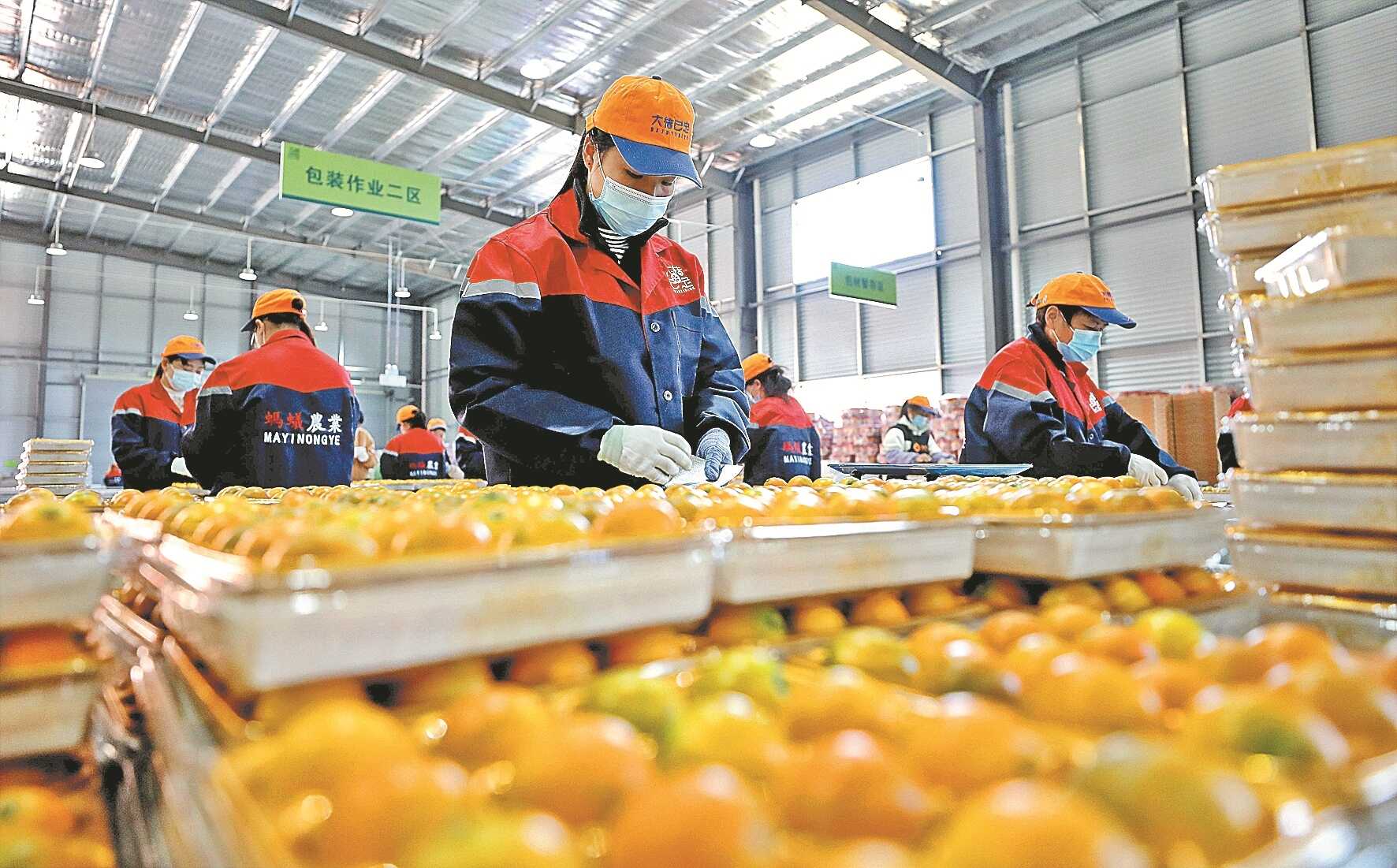 11月21日,在广西融安蚂蚁农业发展有限公司,工人在包装融安金桔。覃庆和 摄
