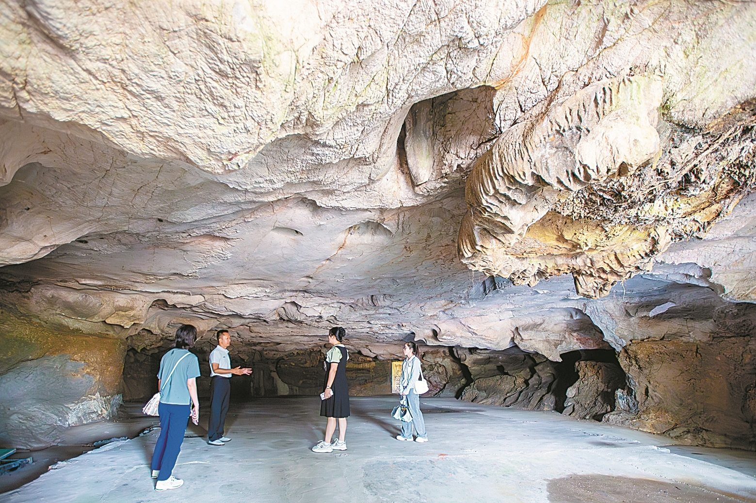 前洞底部是一扇铁门,打开进入,便全然被黑暗包裹。点亮手机,弯腰穿过一段狭窄通道,眼前一下子宽敞起来。幽黑深邃的洞腹与世隔绝,空气湿凉沉滞,仿佛还留存着万年前的气息。就在这里,先民白日采集狩猎、夜晚燃火聚居,在蛮荒之地顽强生存繁衍。