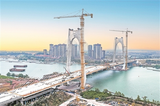1月27日,在平陆运河沙井钦江大桥,工人们在做最后的合龙准备。该桥是钦江与茅尾海分界的标志桥梁,主跨270米,主桥箱梁采用混凝土分离式双边箱断面,共分为87个梁段。