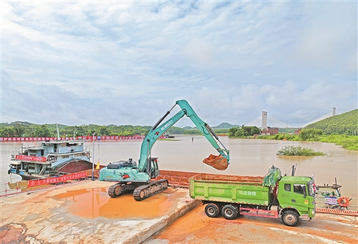8月9日,南宁横州市沙坪河一段,一艘泥驳船停靠岸边,船上装载着从不远处一个江心洲掏挖的泥土,挖掘机正一斗一斗地将船上的泥土装进泥头车内。这里是平陆运河航道1标段的6号临时码头,专门用于转运航道建设挖出的土石方。操作挖掘机的工人陈永春是横州市横州镇人,这位30岁的汉子因平陆运河建设实现了“家门口就业”,对运河建设充满了热情。