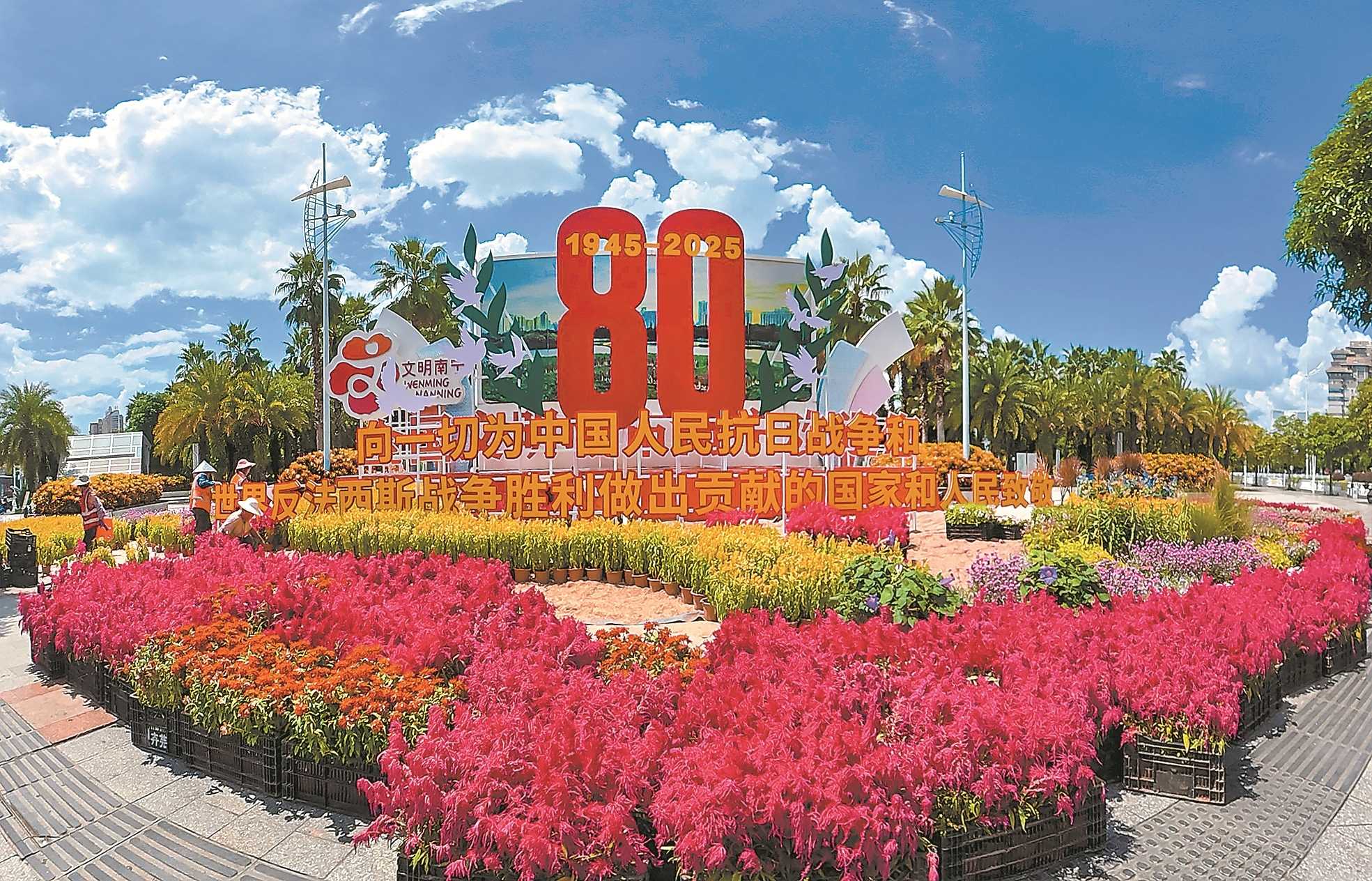 9月1日,纪念中国人民抗日战争暨世界反法西斯战争胜利80周年主题花坛陆续亮相首府南宁街头,营造出庄重热烈的纪念氛围。周军 摄