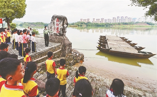 江西省赣州市于都河畔的长征渡口,讲解员正在为小学生讲述红色故事。李劼 摄