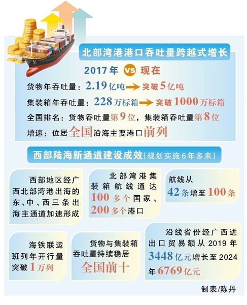 从2017年锚定目标、奋楫启航,到2025年圆梦千万、航线破百,北部湾港的9年,是践行“四个一流”嘱托的9年,是融入共建“一带一路”、建设西部陆海新通道的9年。站在新的历史坐标上,北部湾港这艘巨轮,正向着建设世界一流港口的目标,向着更深、更蓝、更广阔的未来,全速前进。(许丹婷)