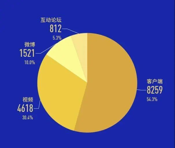 广西两会期间,网友积极参与讨论,在各平台评论信息量占比如下:客户端占比54.3%,视频占比30.4%,微博占比10.0%,互动论坛占比5.3%。