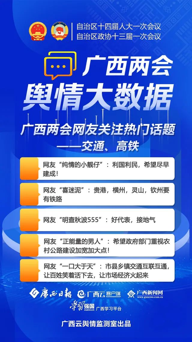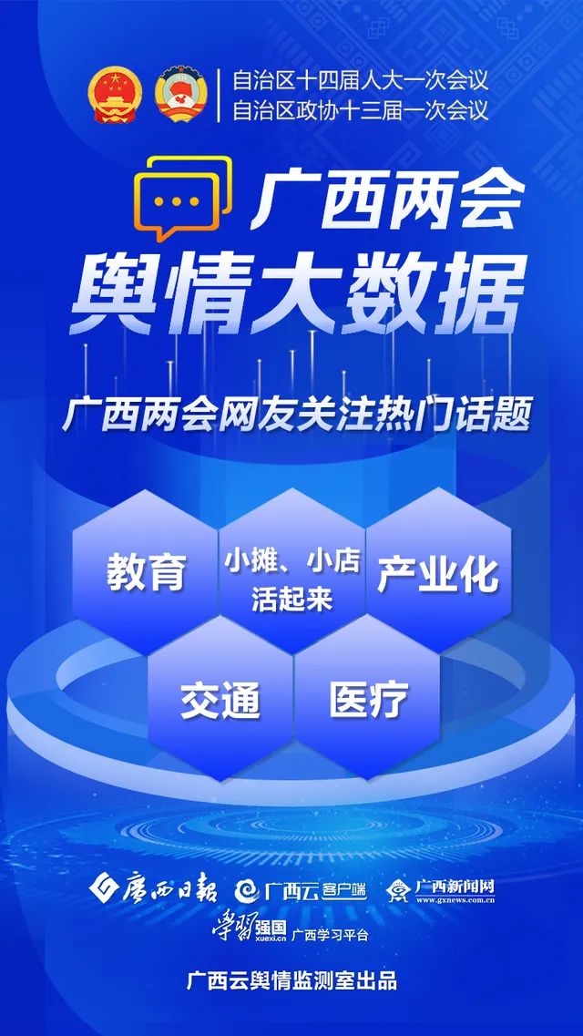 2023年1月10日—1月17日16:00,广西云舆情监测系统显示,网友重点关注“教育”“小摊、小店活起来、火起来”“产业化”“交通”“医疗”五大话题。