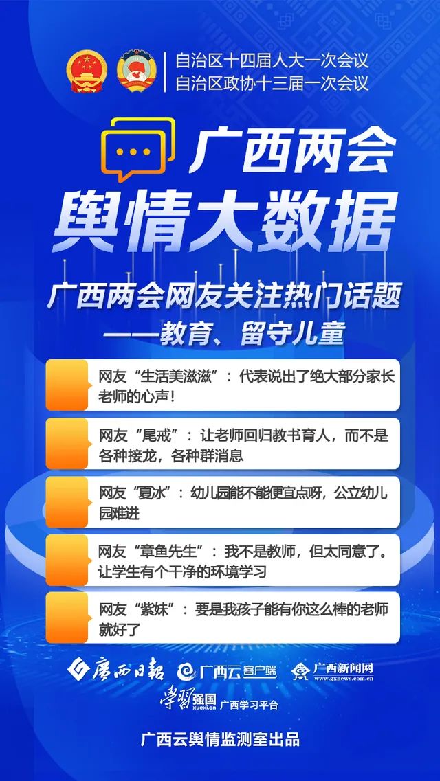 教育话题是广西两会期间关注度较高的话题。网友热议城市优质教育资源不足,农村教育资源短缺的问题。同时,“双减”政策落地后,如何激发孩子的学习兴趣,解决课后服务的需求成为家长们关注的话题。