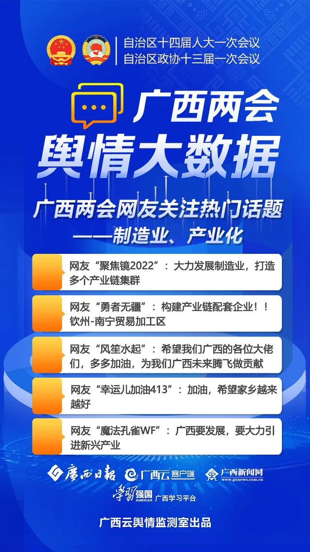 2023年,广西经济社会发展的主要预期目标是:全区地区生产总值增长5.5%左右,规模以上工业增加值增长6.5%。广大网友纷纷关注工业振兴,话题“突出以制造业为重点的产业链招商,深入推进常态化‘走出去’招商”引发热议,期待满满。