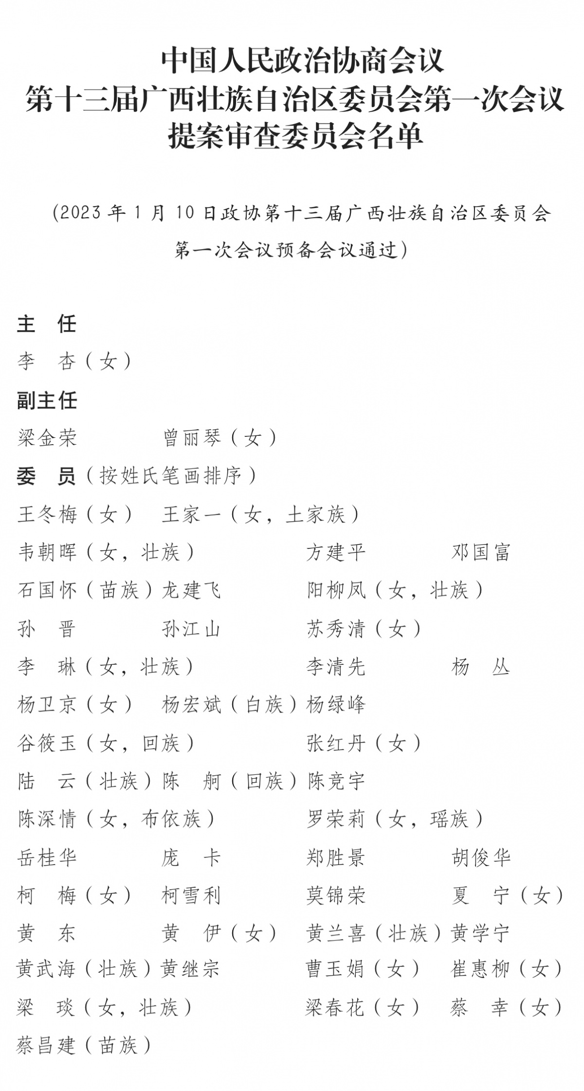 中国人民政治协商会议第十三届广西壮族自治区委员会第一次会议提案审查委员会名单