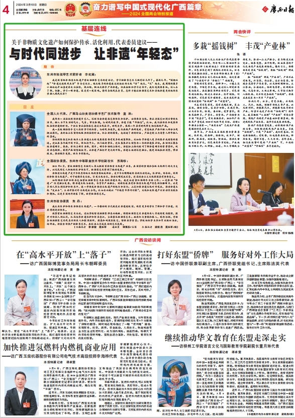 3月10日《广西日报》第004版推出“基层连线”栏目,刊发了《关于非物质文化遗产如何保护传承、活化利用,代表委员建议——与时代同进步 让非遗“年轻态”》一文,详细内容如下↓↓