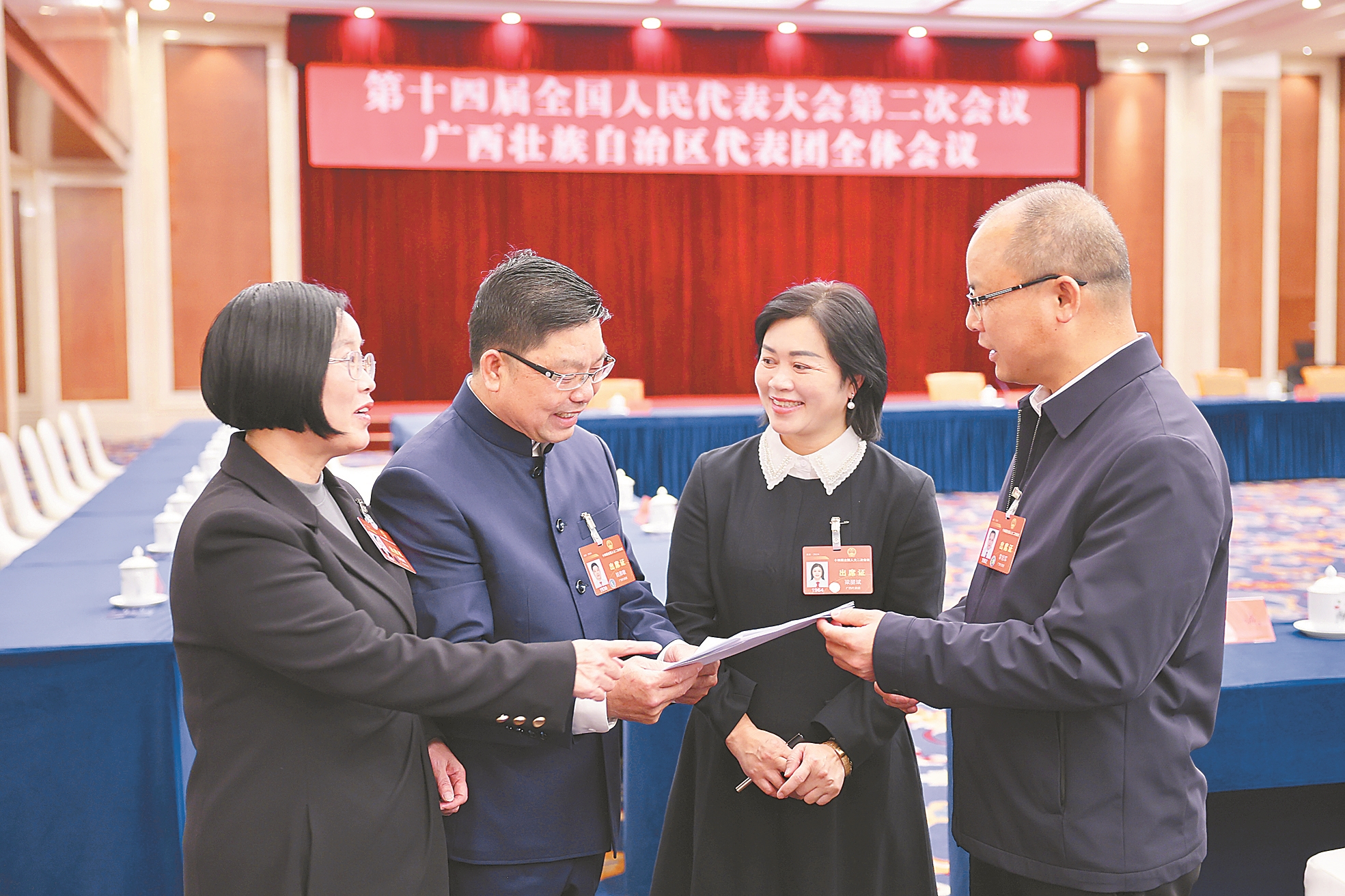 3月4日,全国人大代表陈桂娥、陆弟敏、梁丽斌、黎旭军在一起讨论交流,为向大会提出高质量的议案和建议作准备。邓华 摄