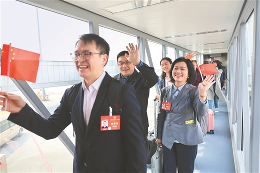 三月十二日,出席十四届全国人大二次会议的广西代表团,在圆满完成会议各项议程后,乘坐飞机返回南宁。黄克 邓华 摄