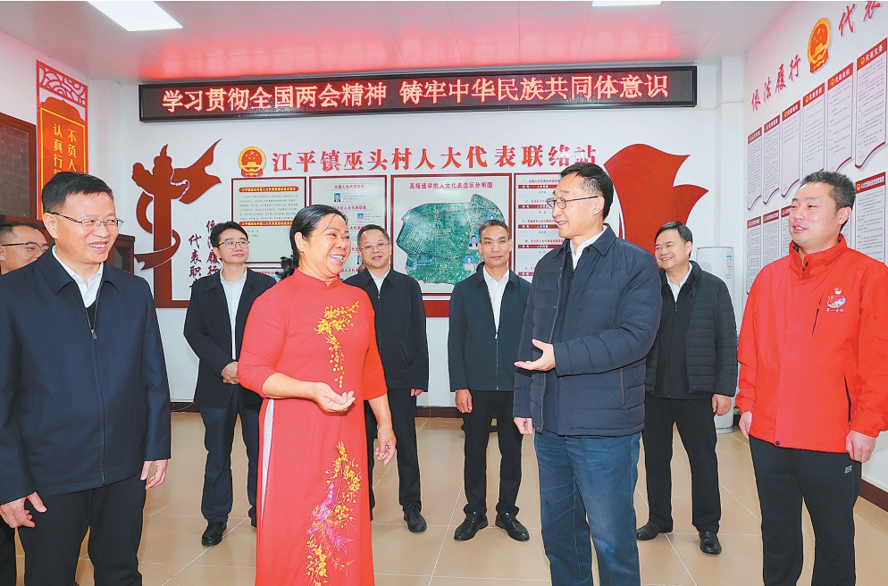 3月14日,自治区党委书记刘宁深入防城港东兴市,宣讲全国两会精神并就推进“一区两地”建设开展调研。来到京族三岛之一的江平镇巫头村,刘宁走进人大代表联络站与基层人大代表交流,详细了解京族群众生产生活以及参与建设铸牢中华民族共同体意识示范区有关情况。黄克 摄