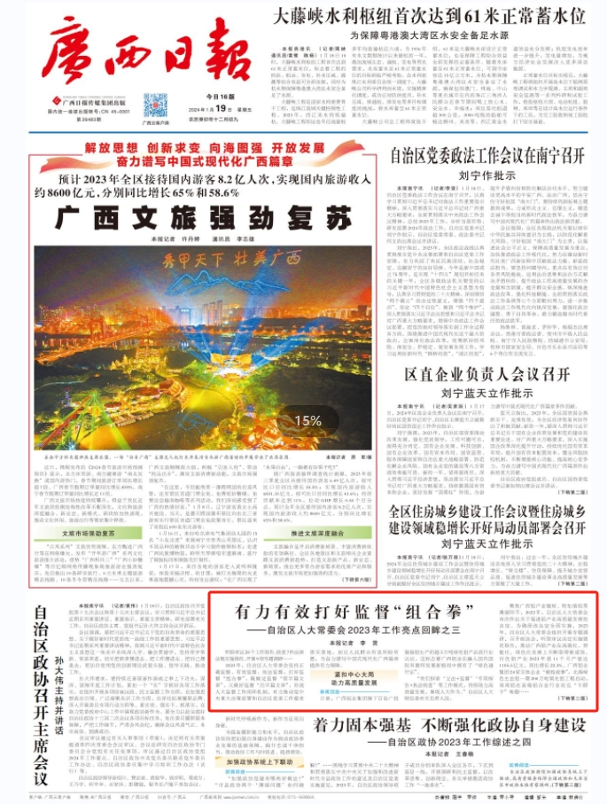 2023年,自治区人大常委会坚持正确监督、有效监督、依法监督,打好监督“组合拳”,既做足监督“前半篇文章”,又做好监督“后半篇文章”,形成人大监督工作闭环机制,有力推动党中央重大决策部署和自治区党委工作要求落实落地,回应人民群众所思所盼所愿,为奋力谱写中国式现代化广西篇章提供有力保障。
