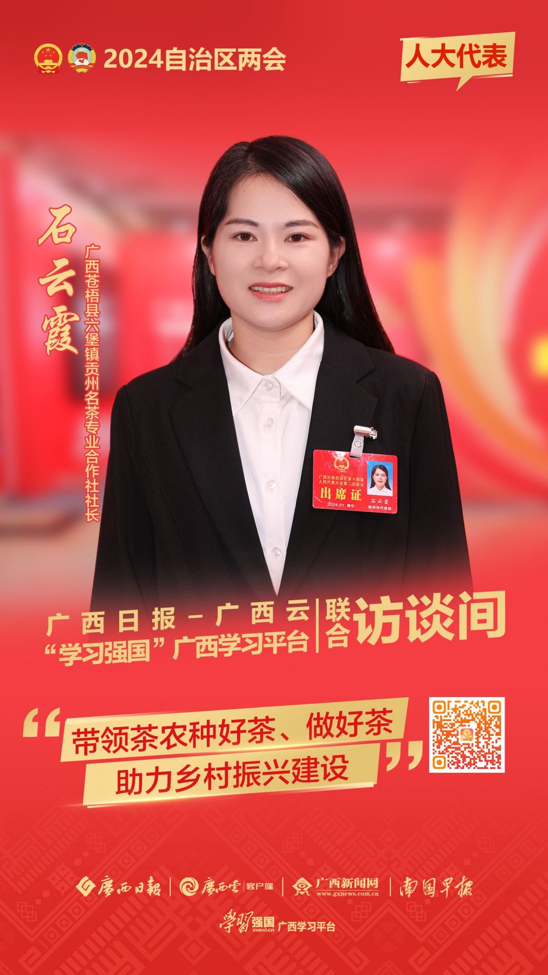 1月22日,自治区两会“广西云x‘学习强国’广西学习平台联合访谈间”迎来自治区人大代表、广西苍梧县六堡镇贡州名茶专业合作社社长石云霞。