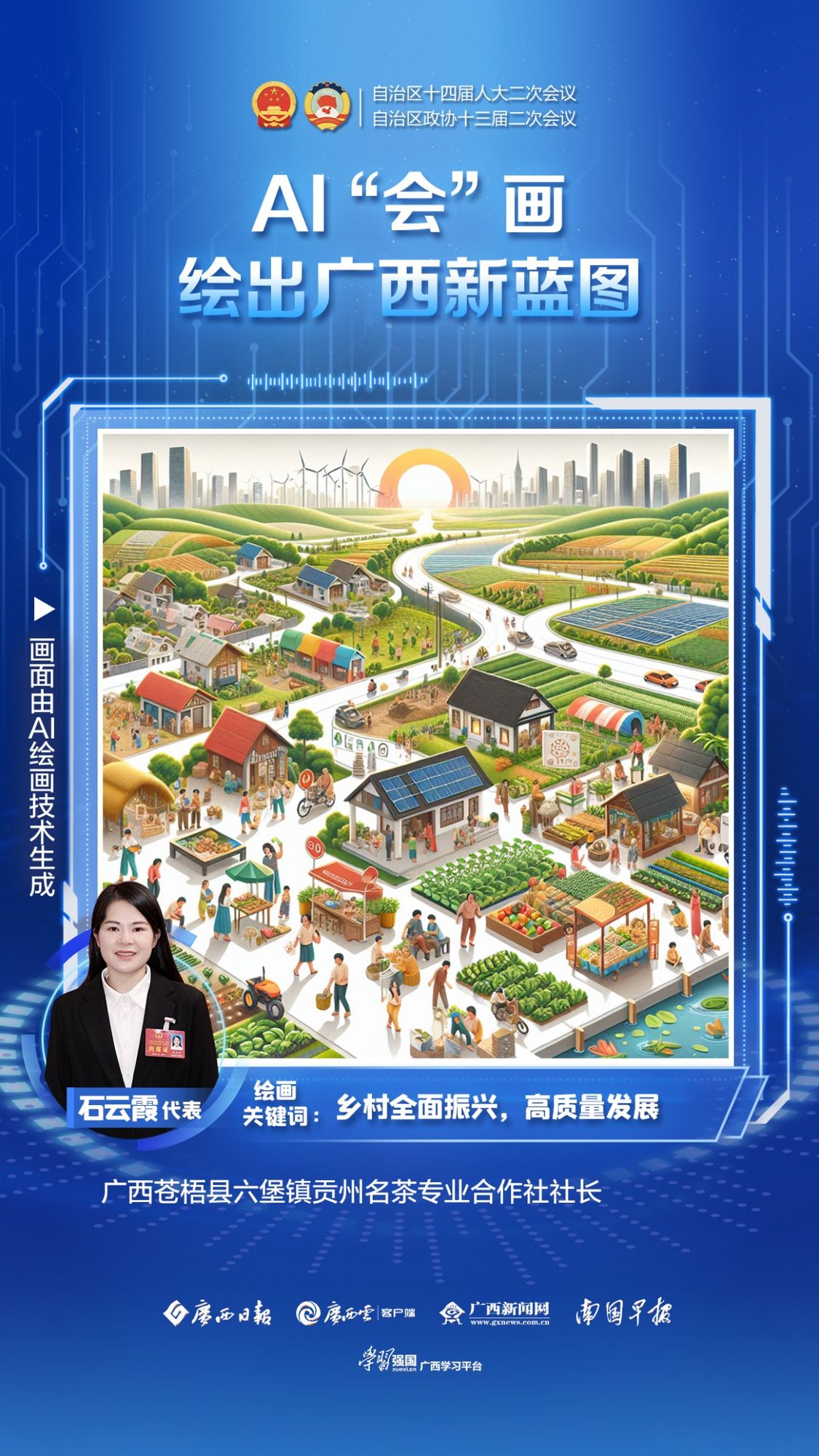两会期间,广西云创新推出短视频栏目《AI“会”画|绘出广西新蓝图》,代表委员们点击选择相关热词,AI便可通过算法技术,数秒内自动生成一张想象与现实融合的AI画作,展现广西各领域的奋进新图景。