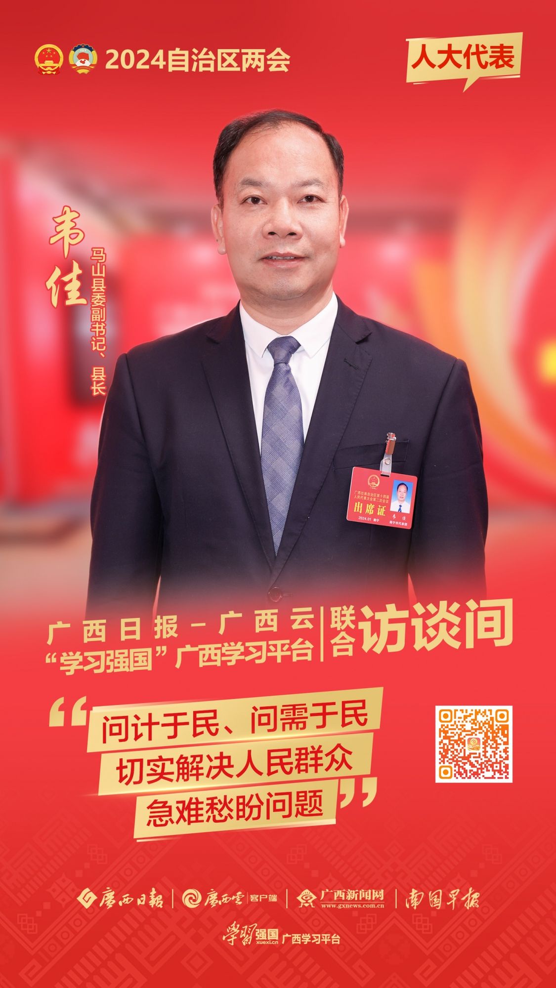 1月22日,自治区两会“广西云x‘学习强国’广西学习平台联合访谈间”迎来自治区人大代表,马山县委副书记、县长韦佳。在韦佳代表眼中,高质量发展必须要落实到民生实事:生命健康、交通体系、饮用水,群众事无小事。