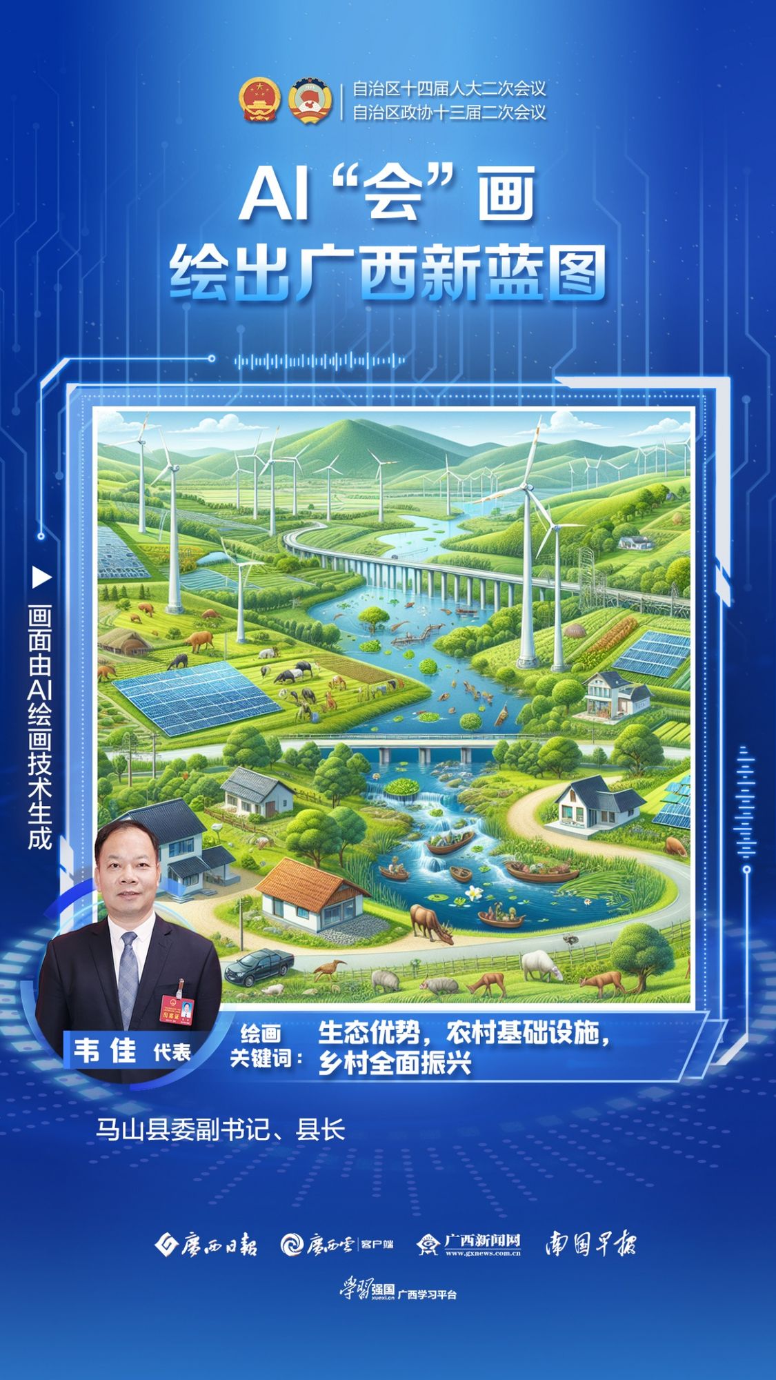 两会期间,广西云创新推出短视频栏目《AI“会”画|绘出广西新蓝图》,代表委员们点击选择相关热词,AI便可通过算法技术,数秒内自动生成一张想象与现实融合的AI画作,展现广西各领域的奋进新图景。