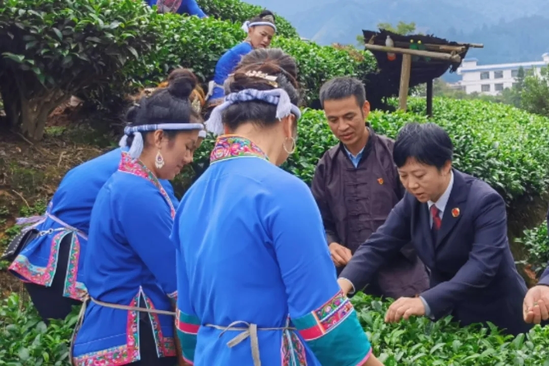 韦震玲深入村落了解村民发展茶产业情况。(受访者供图)