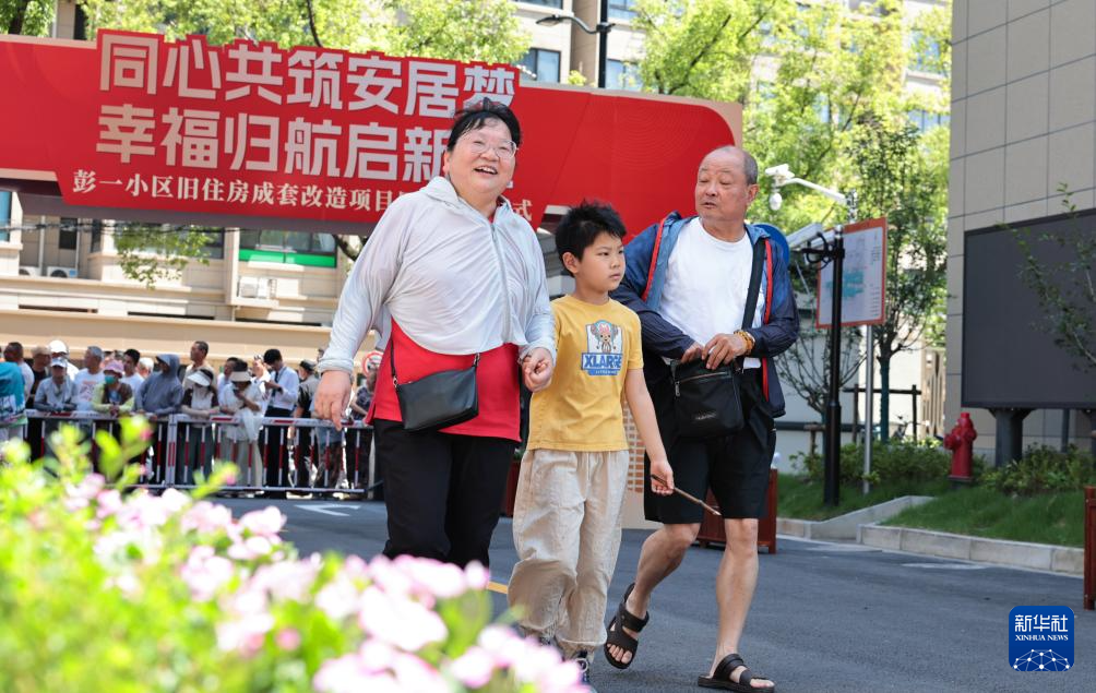 2025年6月29日,上海中心城区最大规模非成套旧住房改造项目——静安区彭浦新村街道彭一小区正式启动回搬。这是首批领取新房钥匙的居民们走进小区。“十四五”时期,我国建设筹集各类保障性住房和城中村、城市危旧房改造等安置住房1100多万套(间),累计改造城镇老旧小区24万多个。(新华社记者 方喆 摄)