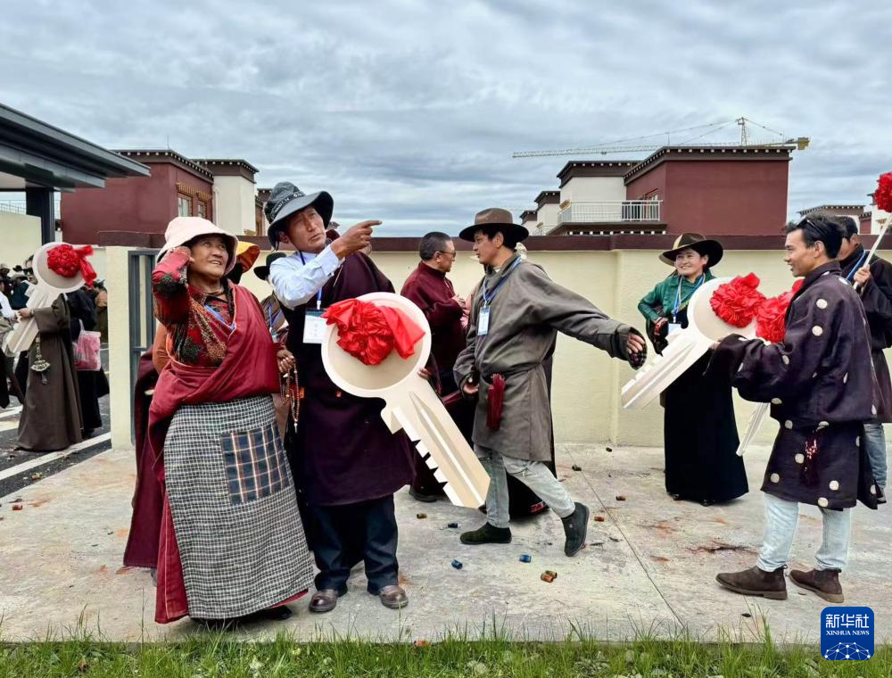 2024年8月10日,在四川省甘孜藏族自治州色达县色柯镇约若新村举行的交房仪式上,牧民们在看新房。“十四五”时期,我国建设筹集各类保障性住房和城中村、城市危旧房改造等安置住房1100多万套(间),累计改造城镇老旧小区24万多个。(新华社记者 江宏景 摄)