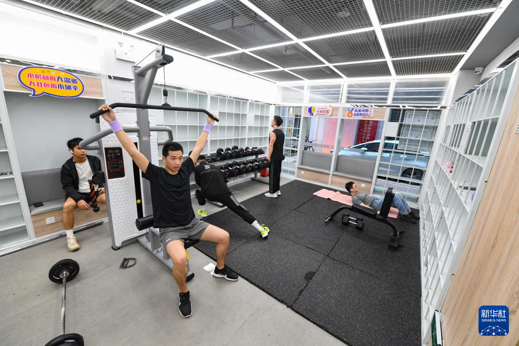 2023年4月2日,在广东省深圳市龙华区元芬村,青年公寓住户在社区增设的健身房锻炼。元芬村曾是深圳市典型的城中村,经过改造后成为干净、整洁、现代的新青年社区。“十四五”时期,我国建设筹集各类保障性住房和城中村、城市危旧房改造等安置住房1100多万套(间),累计改造城镇老旧小区24万多个。(新华社记者 毛思倩 摄)