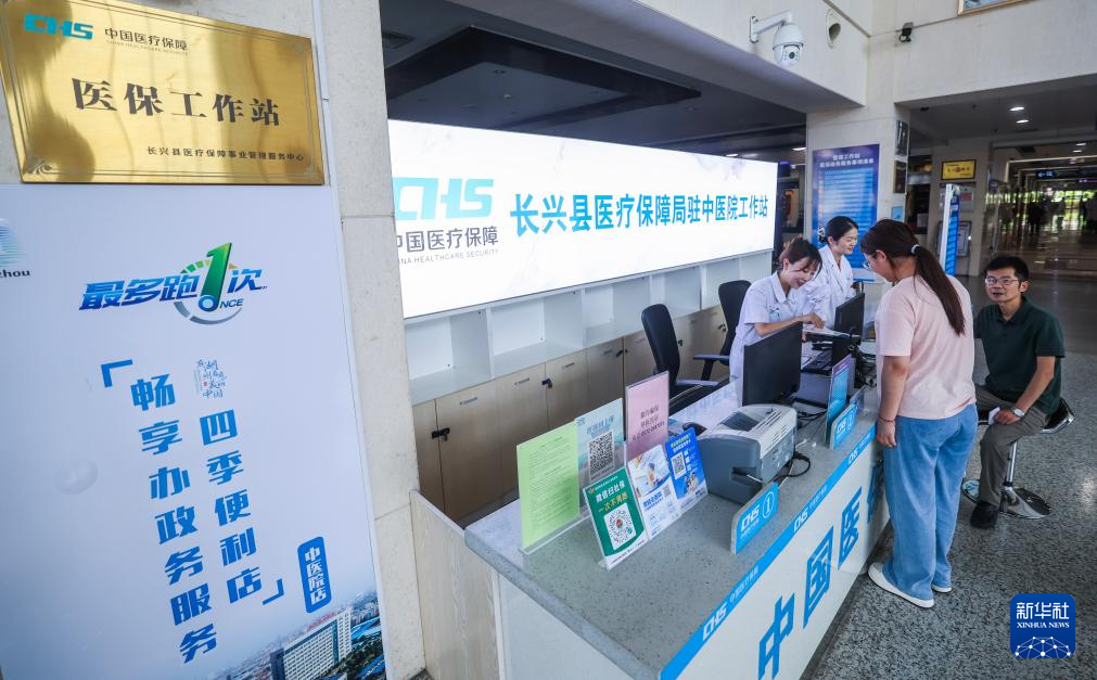 2025年7月3日,浙江省长兴县中医院医保工作站工作人员在给参保人员办理门诊费用报销。“十四五”以来,医保基金累计支出12.13万亿元,年均增速9.1%。(新华社记者 徐昱 摄)