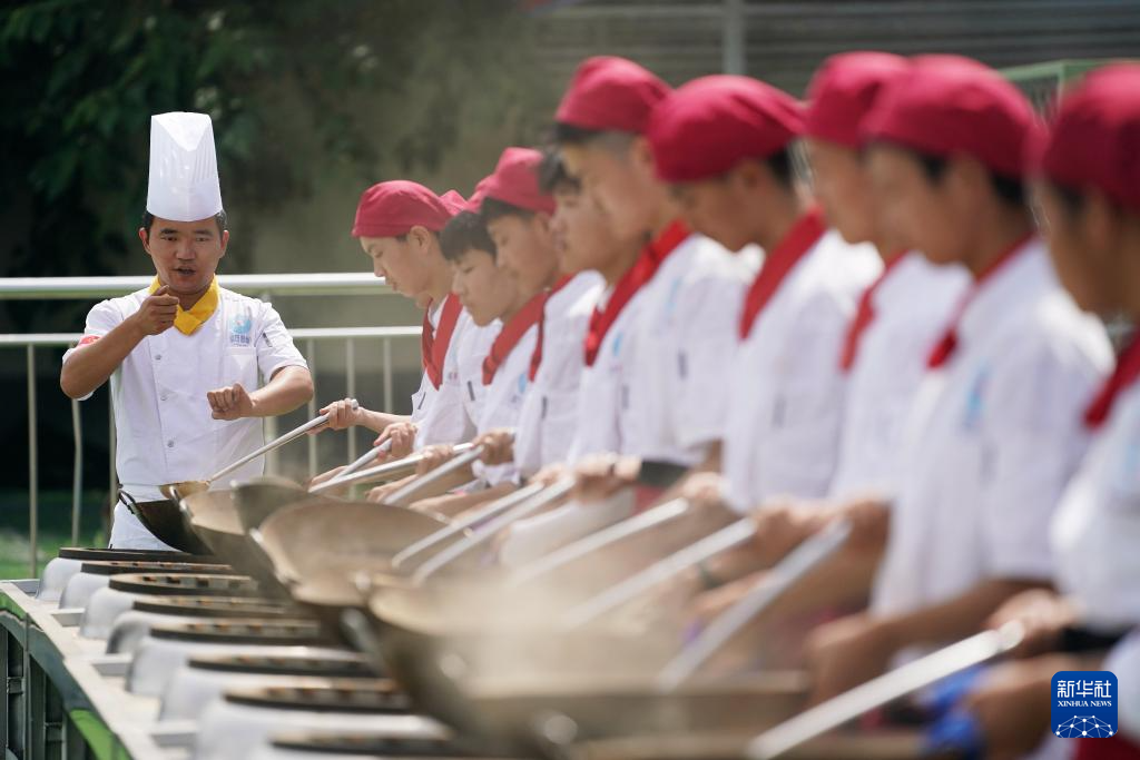 2023年6月25日,在位于陕西西安蓝田县的蓝田厨师学校,教师指导学生们练习翻勺。“十四五”时期,我国教育事业取得历史性成就,职业教育供给了现代产业70%以上新增高素质高技能人才。(新华社记者 李一博 摄)