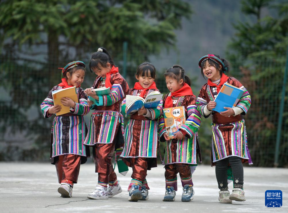 2023年2月16日,在贵州省从江县西山镇中寨教学点,领到新书的瑶族学生在一起交流。“十四五”时期,我国教育事业取得历史性成就,义务教育全国2895个县域实现基本均衡。(新华社记者 杨文斌 摄)