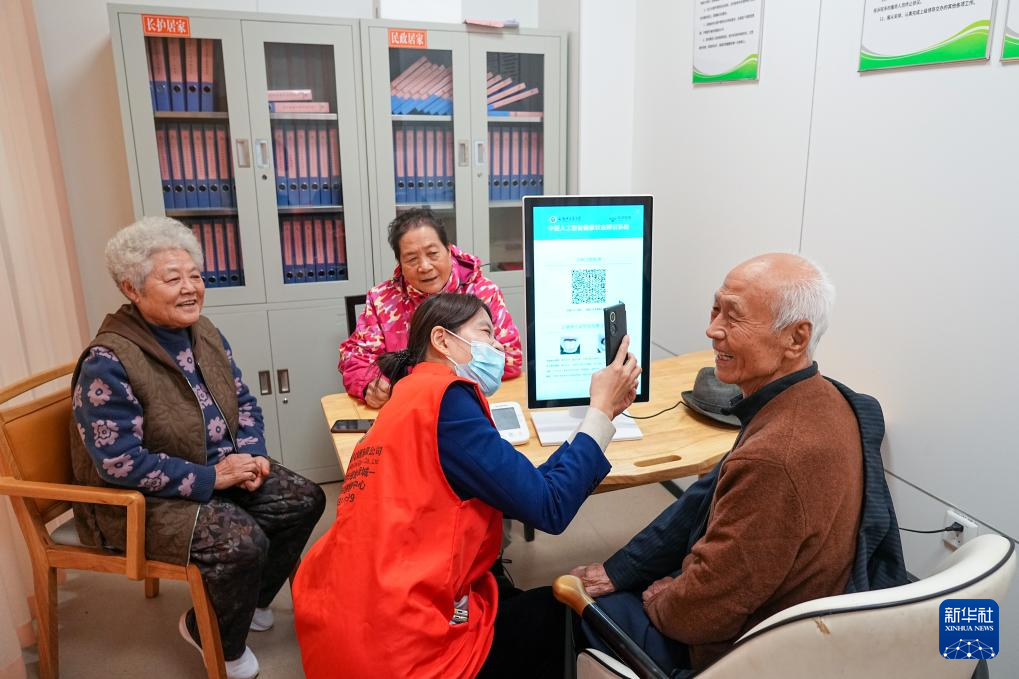 2025年10月23日,老人们在山东省淄博市张店区马尚街道金石社区日间护理中心测量健康数据。中国特色养老服务体系正加速构建,每年为65岁以上老年人提供约1.4亿人次健康管理服务。(新华社记者 朱峥 摄)