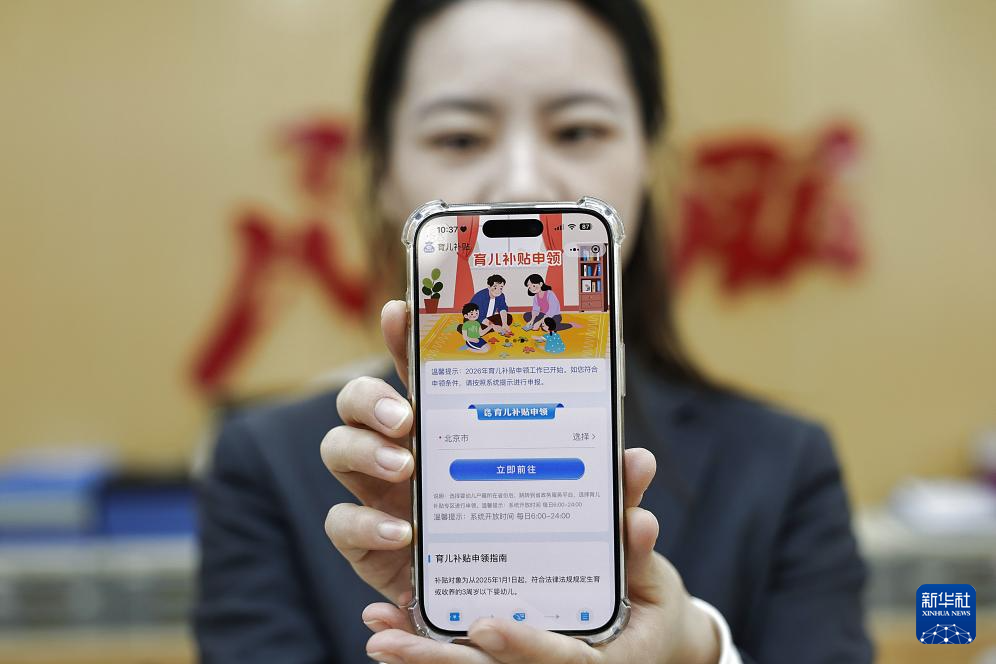 2026年1月5日,工作人员在北京市西城区月坛街道政务服务中心展示“育儿补贴”小程序。“十四五”时期,我国大力推进托育服务体系建设,出台一揽子生育支持政策措施,推动建设生育友好型社会。(新华社记者 张玉薇 摄)