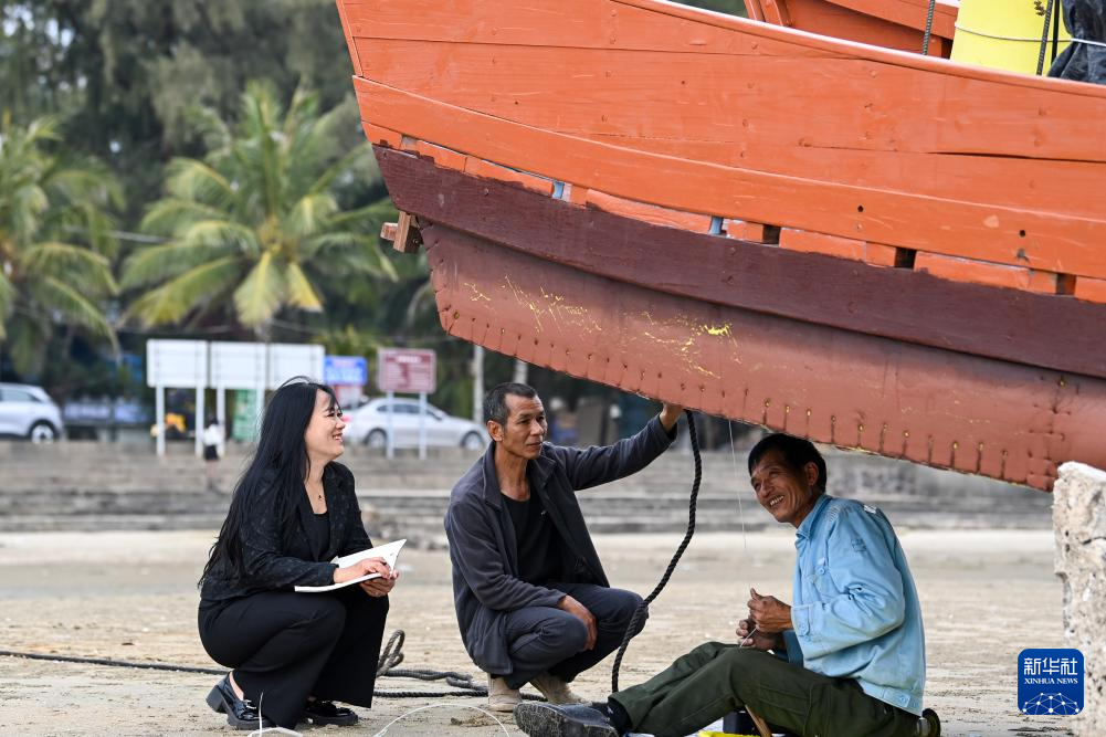 2月7日,在广西东兴市,苏海珍(左)与当地渔民交流,了解他们的期盼。(新华社记者 曹祎铭 摄)