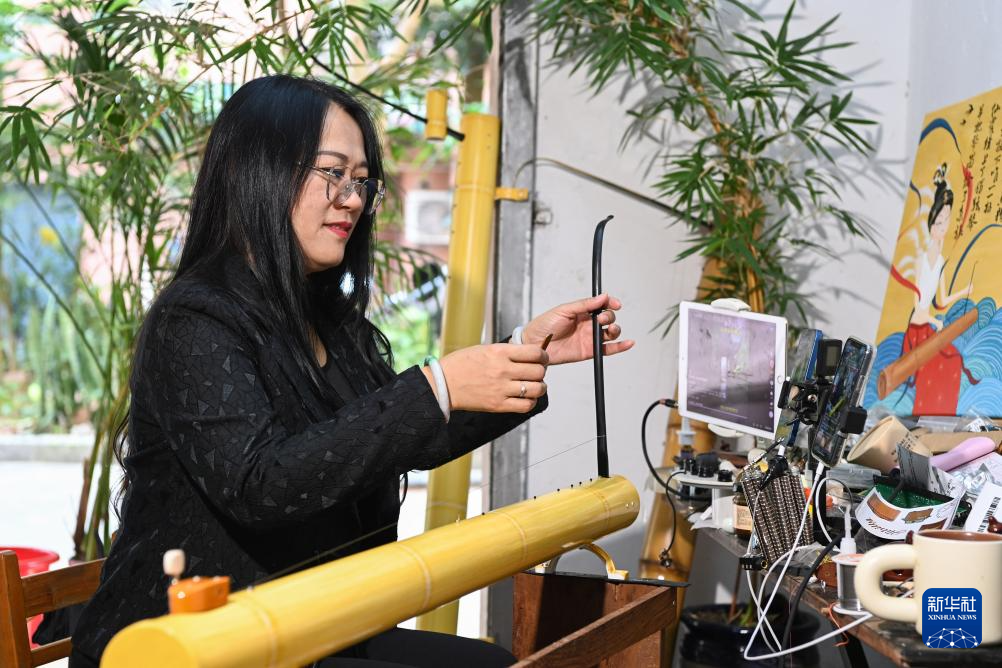 2月7日,苏海珍在位于广西东兴市的工作室内通过手机直播向网民演奏独弦琴。(新华社记者 曹祎铭 摄)