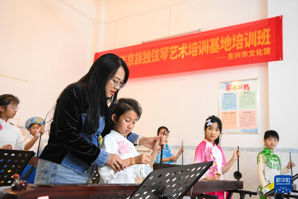 2月6日,在位于广西东兴市的工作室内,苏海珍指导学生弹奏独弦琴。(新华社记者 曹祎铭 摄)