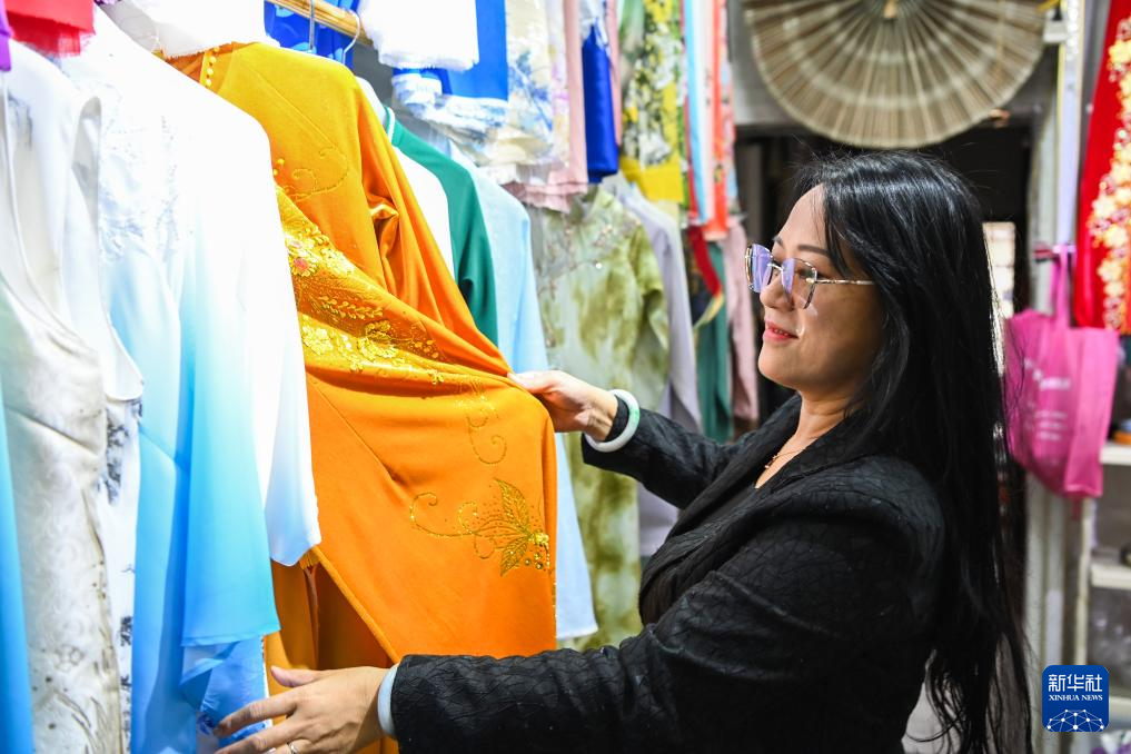 2月7日,在广西东兴市,苏海珍在调研京族服饰的创新与销售情况。(新华社记者 曹祎铭 摄)