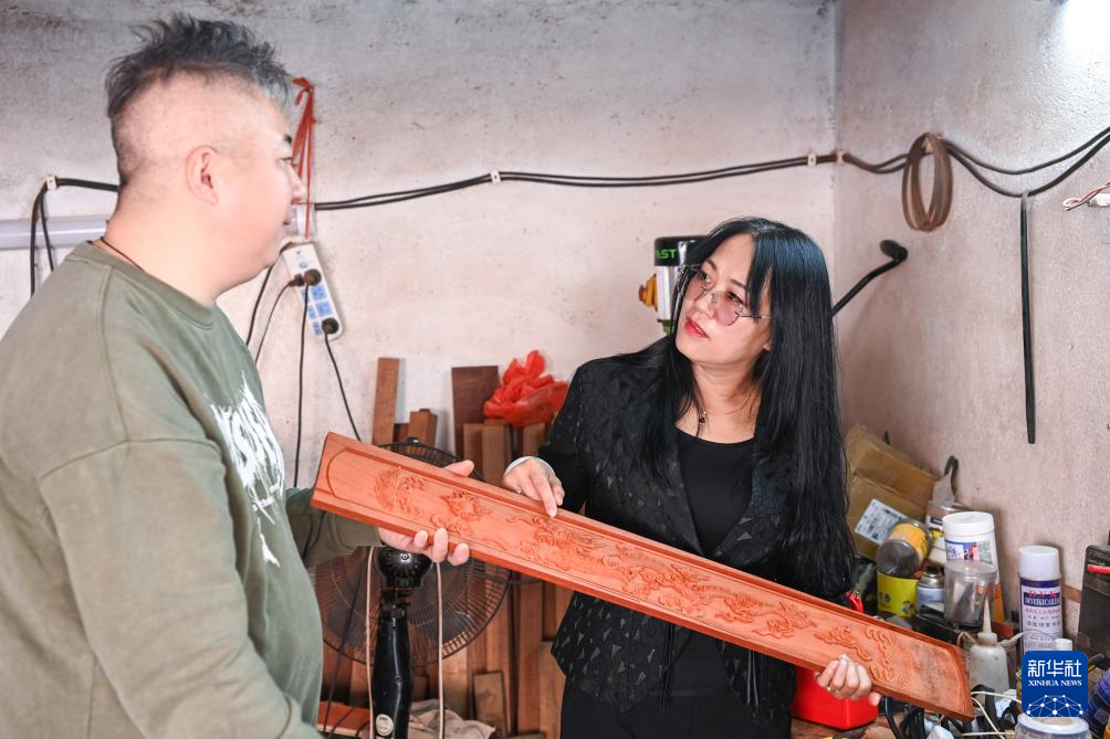 2月7日,在广西东兴市,苏海珍(右)与独弦琴制作匠人讨论琴身材质和纹饰。(新华社记者 曹祎铭 摄)