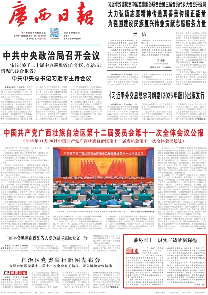 11月28日,中国共产党广西壮族自治区第十二届委员会第十一次全体会议在南宁召开。全会深入学习贯彻党的二十届四中全会精神,听取和讨论了陈刚同志受自治区党委常委会委托所作的工作报告,审议通过了《中国共产党广西壮族自治区委员会关于制定国民经济和社会发展第十五个五年规划的建议》,圆满完成各项议程,这对于动员激励全区广大党员干部群众凝心聚力建设新时代壮美广西具有重要意义。