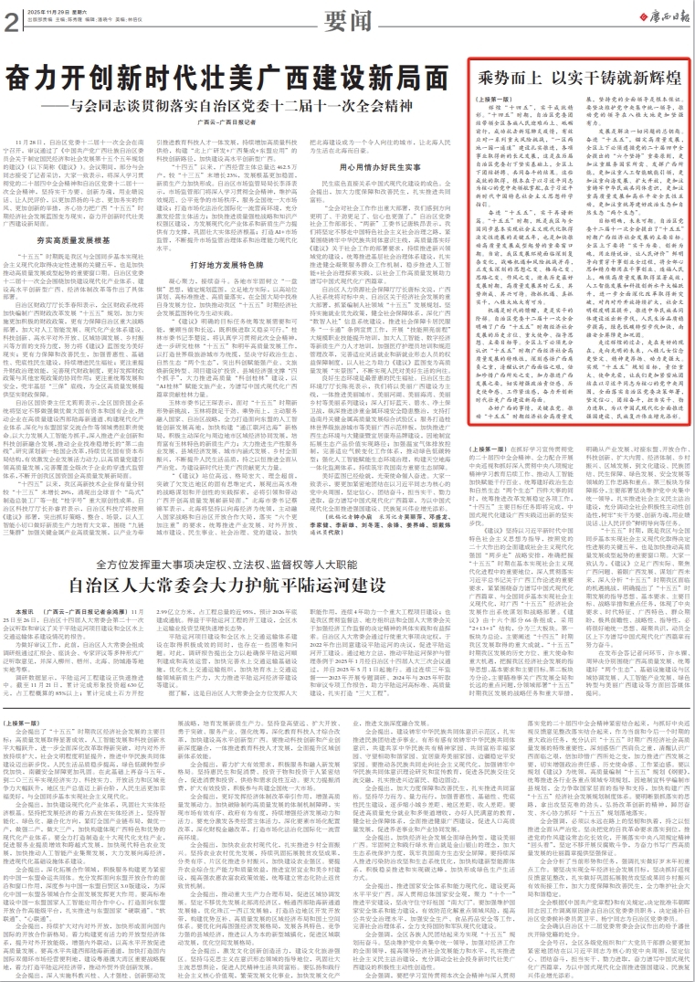 自治区党委十二届十一次全会审议通过的《建议》,坚持以习近平新时代中国特色社会主义思想为指导,深入贯彻落实习近平总书记关于广西工作论述的重要要求,深刻认识“十五五”时期的新形势新要求,对未来广西发展作出全面部署,总体思路清晰明确,目标任务求真务实,体现出中央要求、时代特征、广西特色、群众期盼,必将有力调动全社会投身新时代壮美广西建设的积极性主动性创造性。