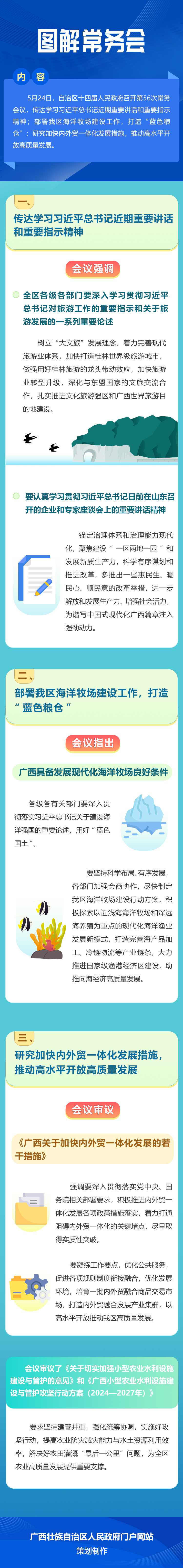 5月24日,自治区十四届人民政府召开第56次常务会议,传达学习习近平总书记近期重要讲话和重要指示精神;部署我区海洋牧场建设工作,打造“蓝色粮仓”;研究加快内外贸一体化发展措施,推动高水平开放高质量发展。