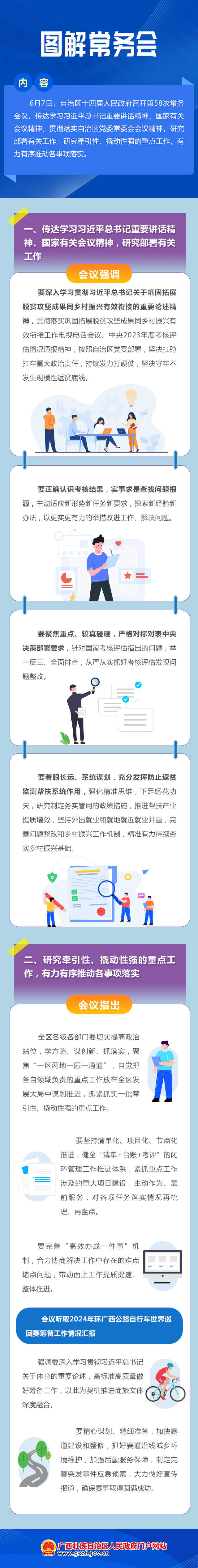 6月7日,自治区十四届人民政府召开第58次常务会议,传达学习习近平总书记重要讲话精神、国家有关会议精神,贯彻落实自治区党委常委会会议精神,研究部署有关工作;研究牵引性、撬动性强的重点工作,有力有序推动各事项落实。