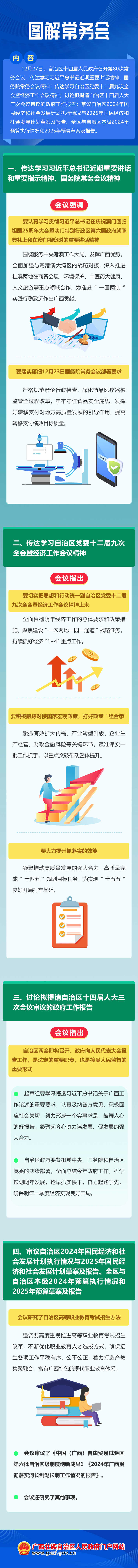 12月27日,自治区十四届人民政府召开第80次常务会议,传达学习习近平总书记近期重要讲话精神、国务院常务会议精神;传达学习自治区党委十二届九次全会暨经济工作会议精神;讨论拟提请自治区十四届人大三次会议审议的政府工作报告;审议自治区2024年国民经济和社会发展计划执行情况与2025年国民经济和社会发展计划草案及报告、全区与自治区本级2024年预算执行情况和2025年预算草案及报告。