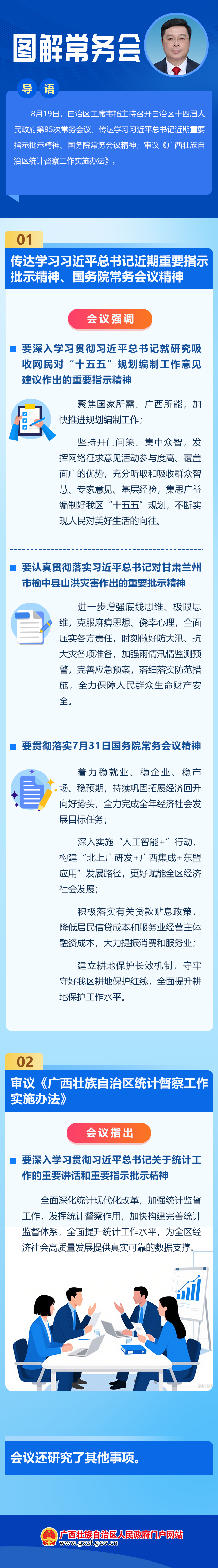 8月19日,自治区主席韦韬主持召开自治区十四届人民政府第95次常务会议,传达学习习近平总书记近期重要指示批示精神、国务院常务会议精神;审议《广西壮族自治区统计督察工作实施办法》。