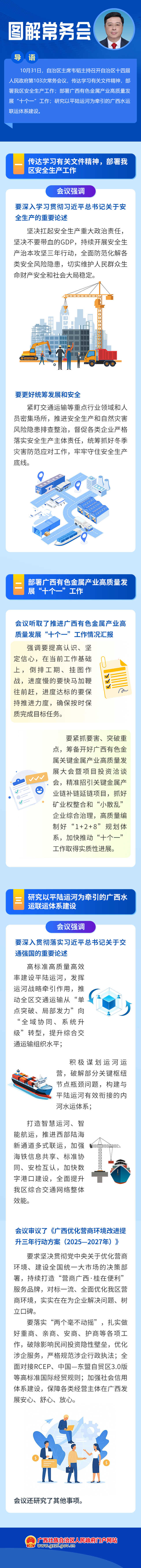 10月31日,自治区主席韦韬主持召开自治区十四届人民政府第103次常务会议,传达学习有关文件精神,部署我区安全生产工作;部署广西有色金属产业高质量发展“十个一”工作;研究以平陆运河为牵引的广西水运联运体系建设。