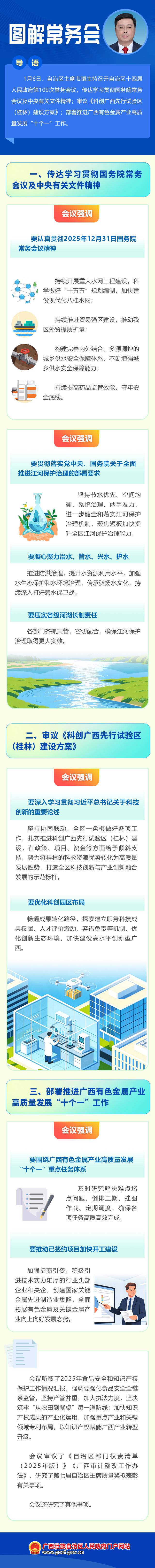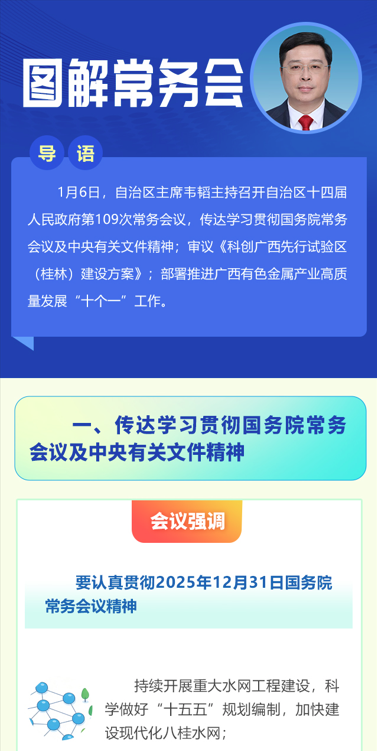 1月6日,自治区主席韦韬主持召开自治区十四届人民政府第109次常务会议,传达学习贯彻国务院常务会议及中央有关文件精神;审议《科创广西先行试验区(桂林)建设方案》;部署推进广西有色金属产业高质量发展“十个一”工作。