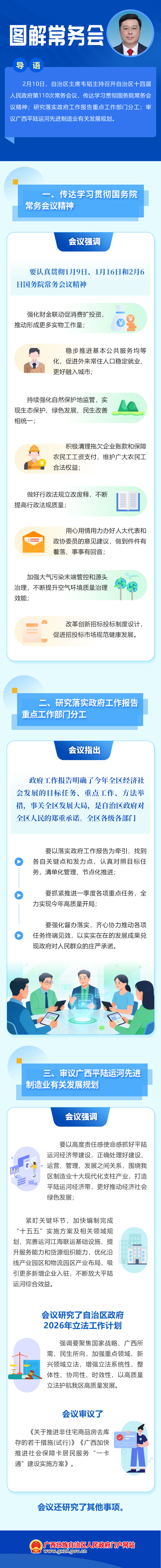 2月10日,自治区主席韦韬主持召开自治区十四届人民政府第110次常务会议,传达学习贯彻国务院常务会议精神;研究落实政府工作报告重点工作部门分工;审议广西平陆运河先进制造业有关发展规划。