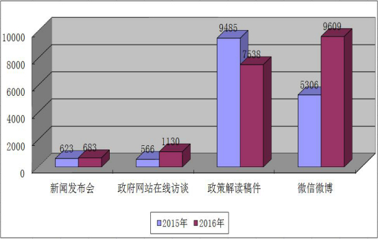 2016年,全区回应公众关注热点或重大舆情数1.91万余次。其中,通过参加或举办新闻发布会回应解读为683次,通过政府网站在线访谈回应解读为1130次,发布政策解读稿件7538篇,通过微信微博回应事件数9609次。其他方式回应事件26593次。与2015年相比,政府网站在线访谈及微信微博回应解读的数量均有较大提升,突显了新媒体平台交互功能。