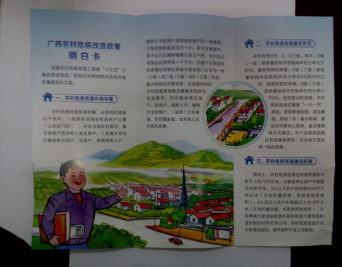 四是做好农村危房改造信息公开。2016年8月,自治区出台了《2016年广西农村危房改造暨脱贫攻坚建档立卡贫困户危房改造实施方案》(桂政办发〔2016〕102号)。为帮助广大群众更好地了解农村危房改造相关政策,于2016年10月份编印了300万张“广西农村危房改造政策明白卡”,免费发放给全区农村住户,对群众关心的农村危房改造对象认定过程、补助资金标准和分配情况等信息进行公开,让全社会了解、支持和监督农村危房改造工作。