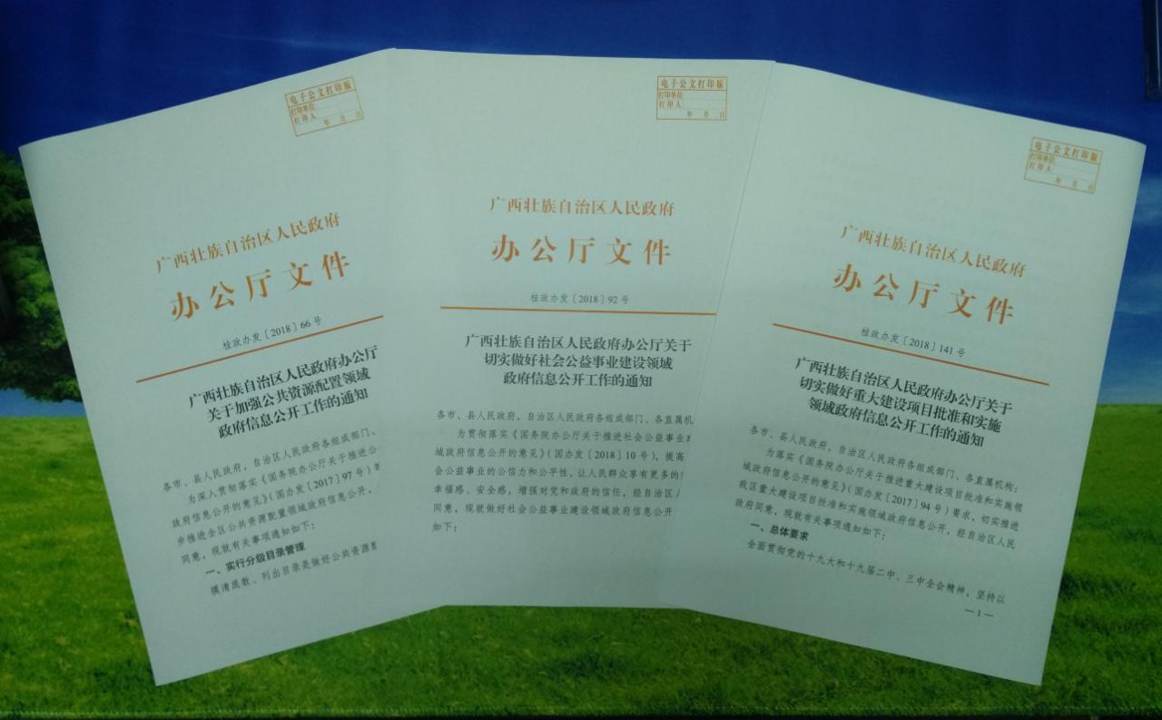 印发《广西壮族自治区人民政府办公厅关于加强公文公开属性源头认定工作的通知》(桂政办函〔2018〕2号),规范公文公开属性的源头管理,解决各级行政机关公文公开属性把握不到位的问题。印发《广西壮族自治区人民政府办公厅关于加强公共资源配置领域政府信息公开工作的通知》(桂政办发〔2018〕66号)、《广西壮族自治区人民政府办公厅关于切实做好社会公益事业建设领域政府信息公开工作的通知》(桂政办发〔2018〕92号)和《广西壮族自治区人民政府办公厅关于切实做好重大建设项目批准和实施领域政府信息公开工作的通知》(桂政办发〔2018〕141号)等文件,进一步细化重点领域信息公开内容,扩大公开范围,增强公开质量。